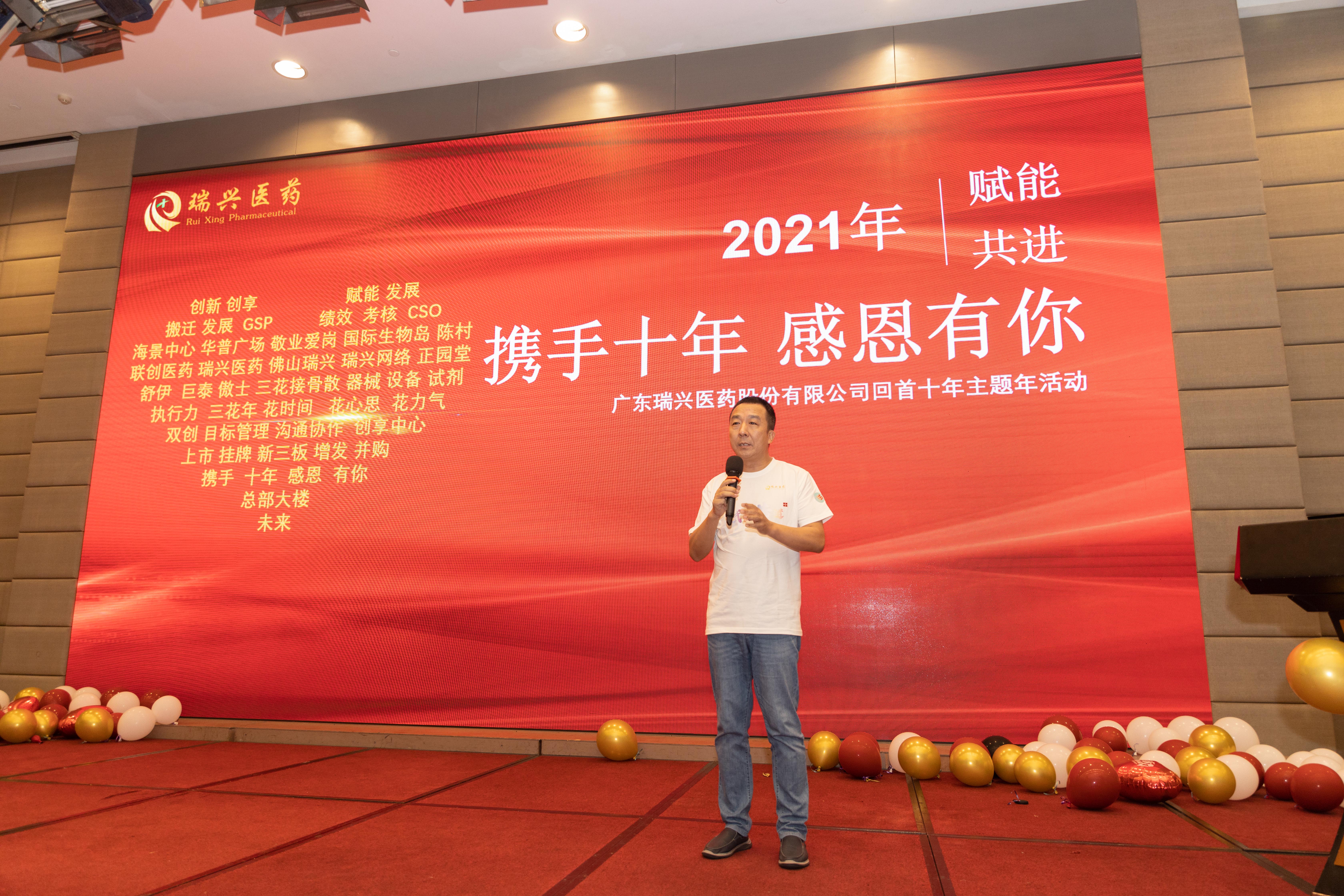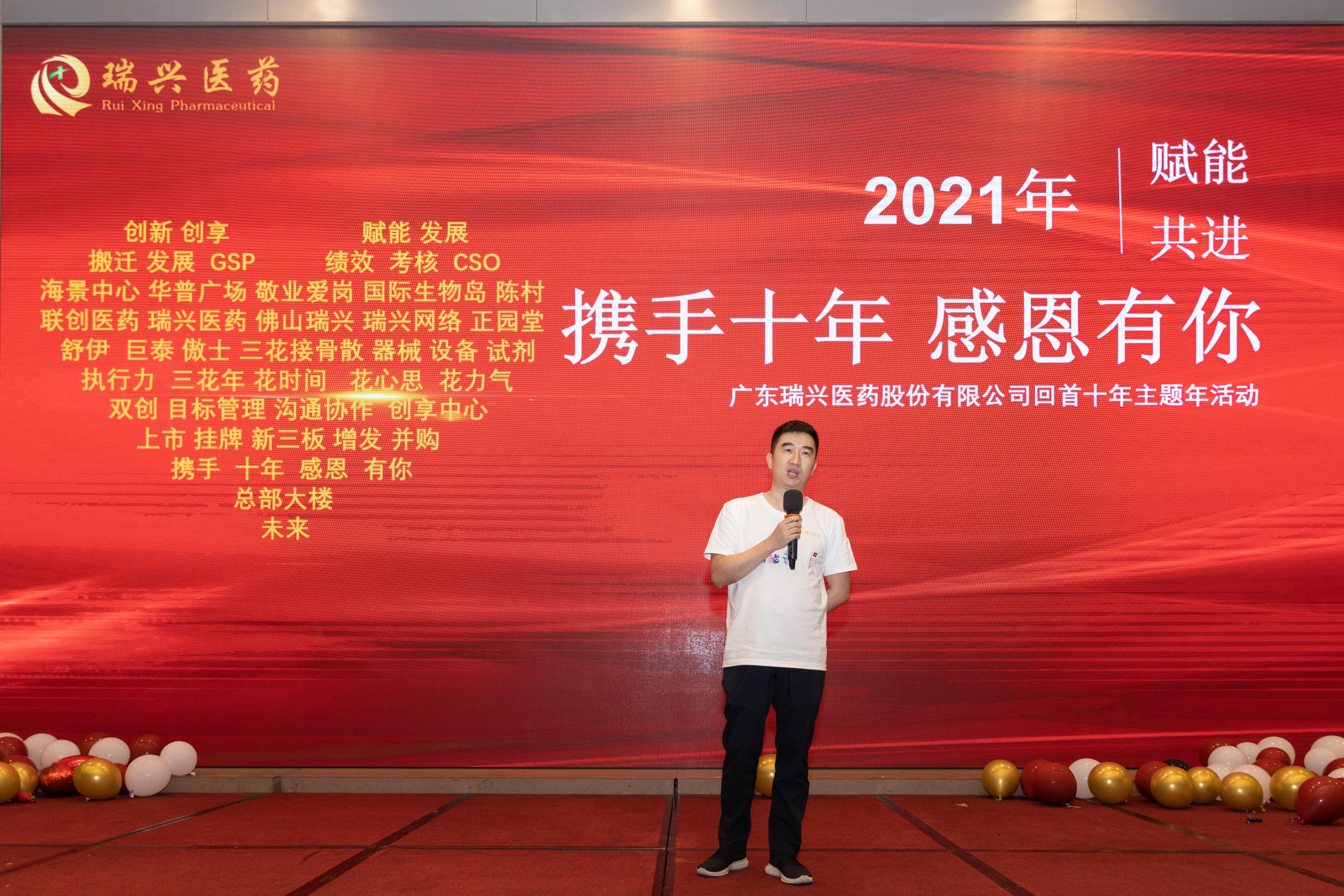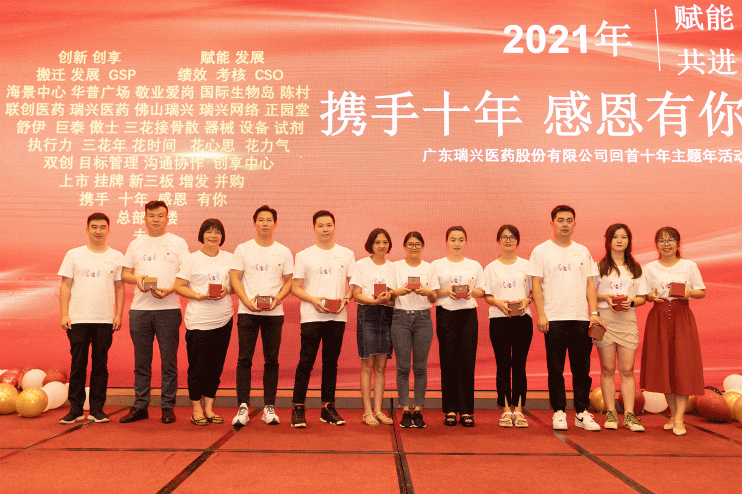 “攜手十年,感恩有你”,瑞興醫(yī)藥十周年暨主題年回顧活動于2021年7月18日下午在北滘鉑爾曼酒店順利舉行并取得了圓滿成功。從門口的簽到墻,到整齊擺放的瑞興令和統(tǒng)一的服裝,每一個環(huán)節(jié)都充滿了紀念的意義。本次活動中公司董事長黃凌云先生、總經理欒廣根先生、副總經理周益先生以及營銷中心總經理陳廣明女士應邀出席?;顒蝇F(xiàn)場在瑞興全體員工的見證下回憶滿滿,感慨萬千。
