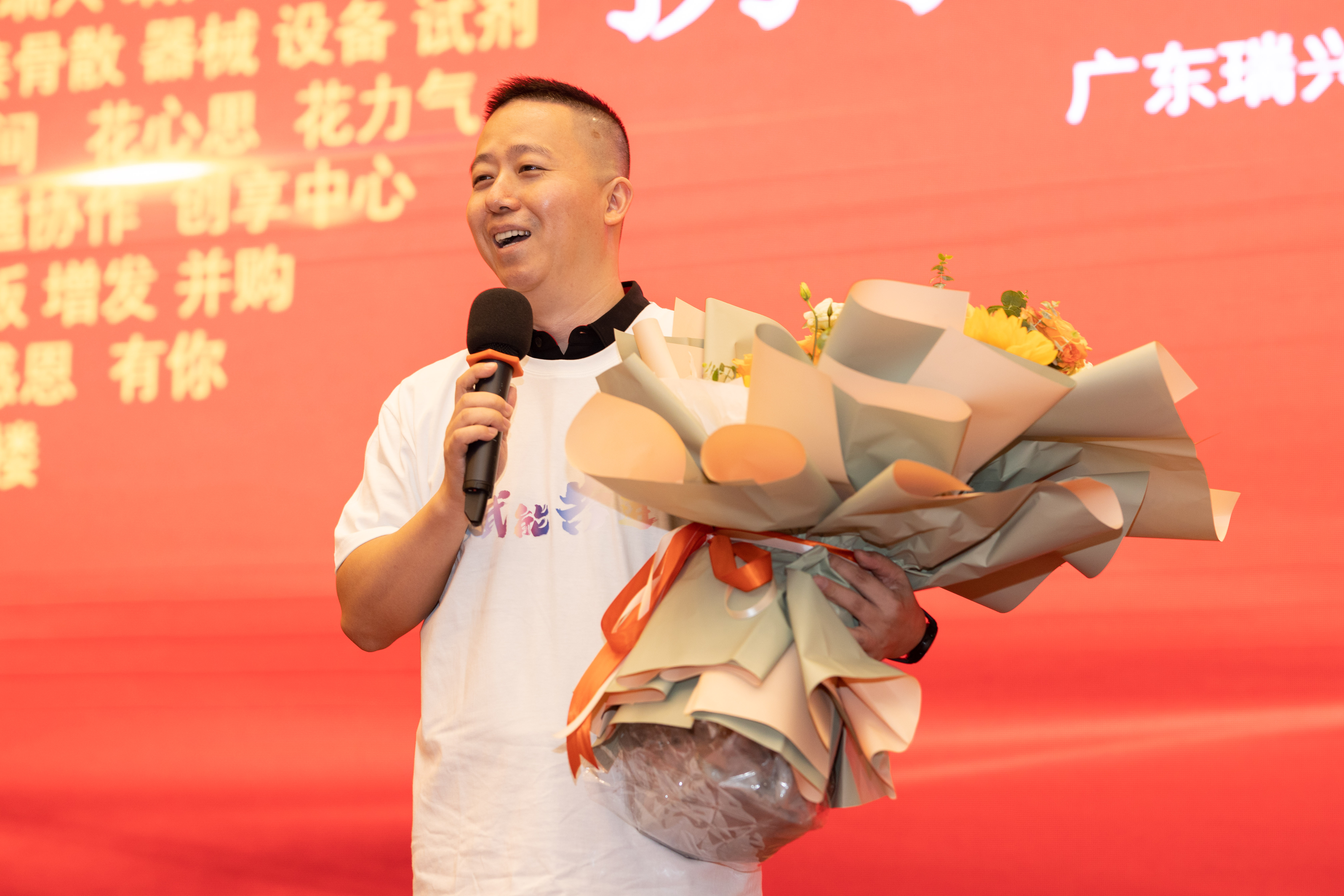 隨后,周益副總經理現(xiàn)場作了一首詩,周公子的稱號名不虛傳,欒廣根總經理回憶了和黃董十多年來戰(zhàn)友般的情誼,緣分讓我們凝聚在一起,共同的目標造就了一支“拉得出、打得響”的團隊;最后,黃凌云董事長跟我們講述了他這么多年來的回憶,當過兵、創(chuàng)過業(yè),闖闖蕩蕩,最終和欒總一起攜手創(chuàng)辦了如今的瑞興醫(yī)藥。十年相守不易,除了同事的身份,我們更是一家人。