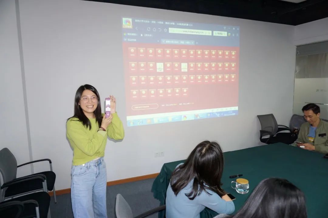 隨著主持人一聲令下,活動正式開始,同時投影儀上呈現(xiàn)出了第二個亮點--由幾十個紅包封面組成的抽獎頁面。紅包里面驚喜滿滿,同事們躍躍欲試。首先是人事行政部的同事自告奮勇,點開了第一個紅包封面,出現(xiàn)的是“邱海玲”,因此邱海玲作為第一個站上舞臺分享案例的同事,分享完畢,她也獲得一次抽紅包的機(jī)會,想必是運氣非常不錯的一天,抽到了小獎品“護(hù)手霜”一支。